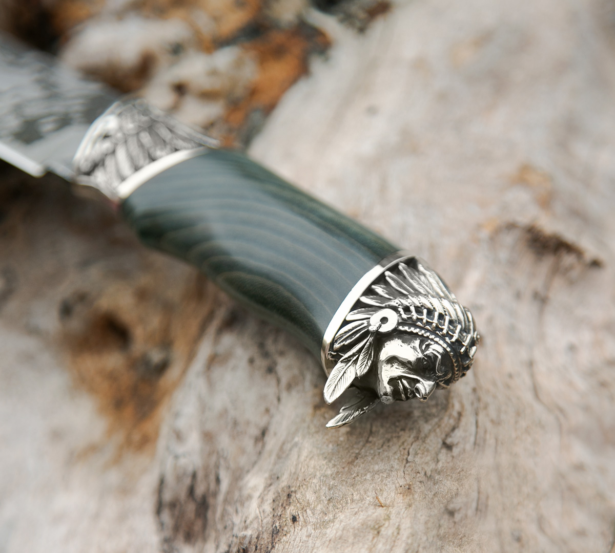 Нож Сибиряк из булатной стали с травлением, рукоять - стабилизированный дальневосточный ясень, кожаный чехол в комплекте.