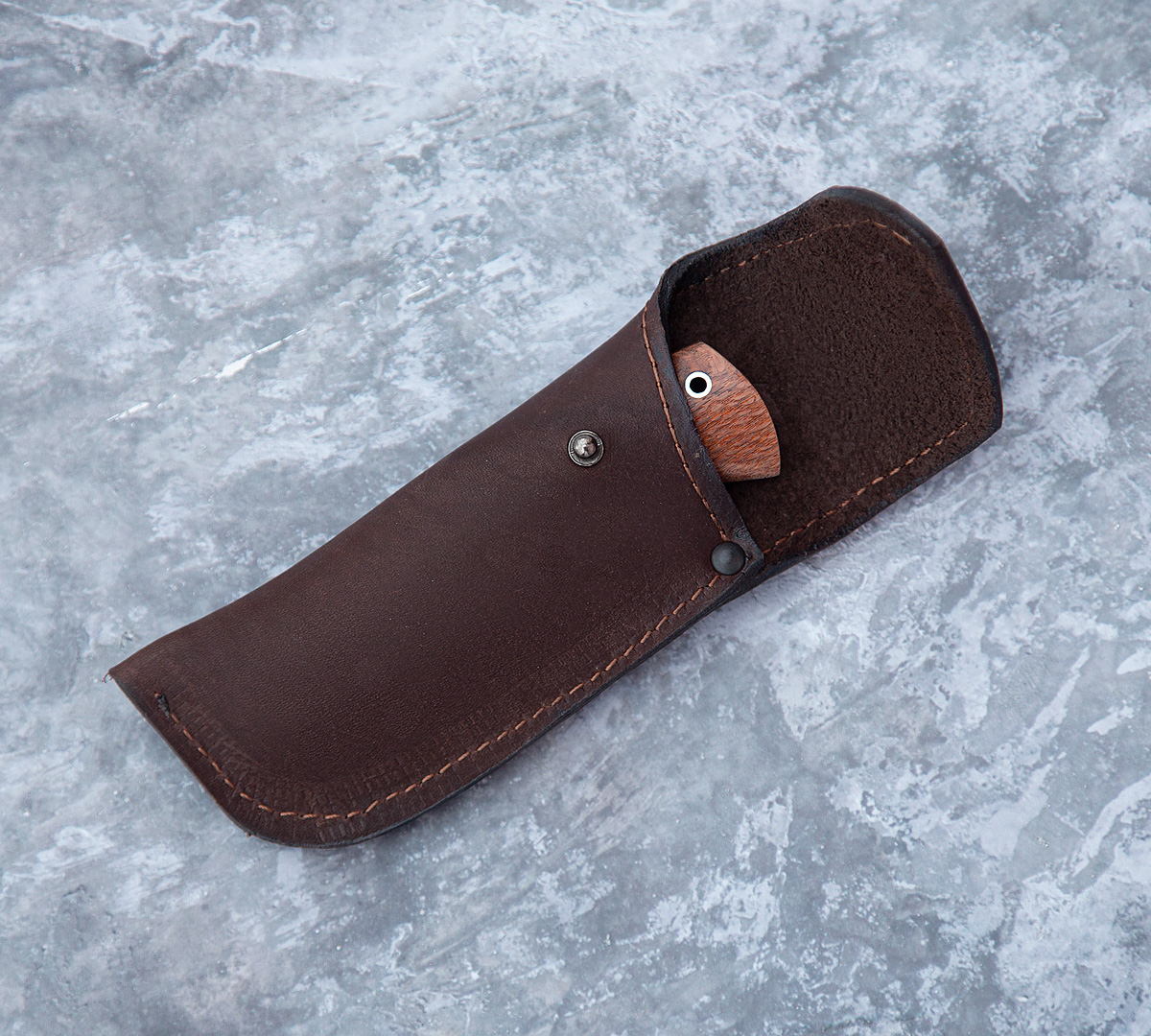 Нож Складной №1 из булатной стали, рукоять - бубинга, кожаный чехол идет в комплекте.