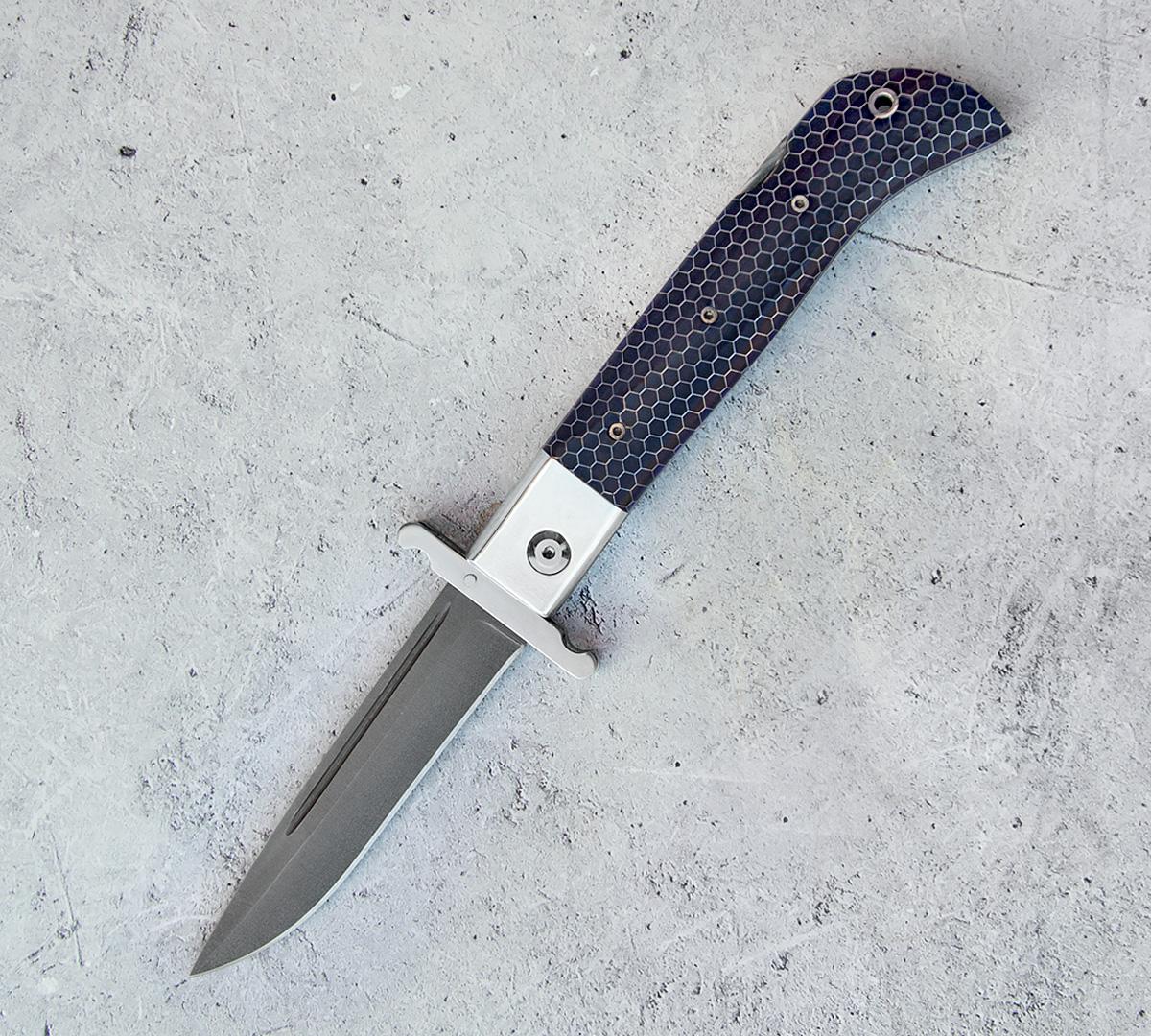 Складная Финка из булатной стали, рукоять - акрил, кожаный чехол идет в комплекте.