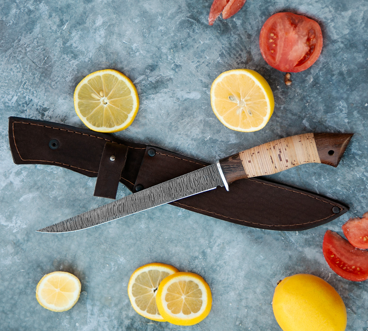 Филейный нож из дамасской стали, рукоять - Венге + береста. Кожаный чехол идет в комплекте