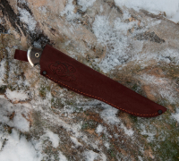 Нож Клыч из дамасской стали, рукоять - стабилизированная карельская береза + лосинный рог, сквозной монтаж рукояти, кожаный чехол идет в комплекте.