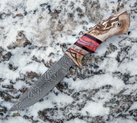 Нож Гефест из мозаичной дамасской стали, рукоять - рог лося (выжигание на кости), вставка - зуб мамонта, кожаный чехол идет в комплекте