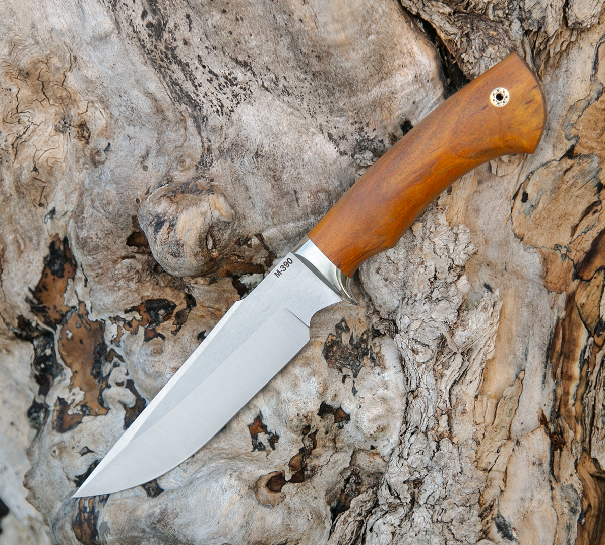 Нож Гефест из порошковой нержавеющей стали М390, рукоять - стабилизированная карельская береза, кожаный чехол в комплекте.