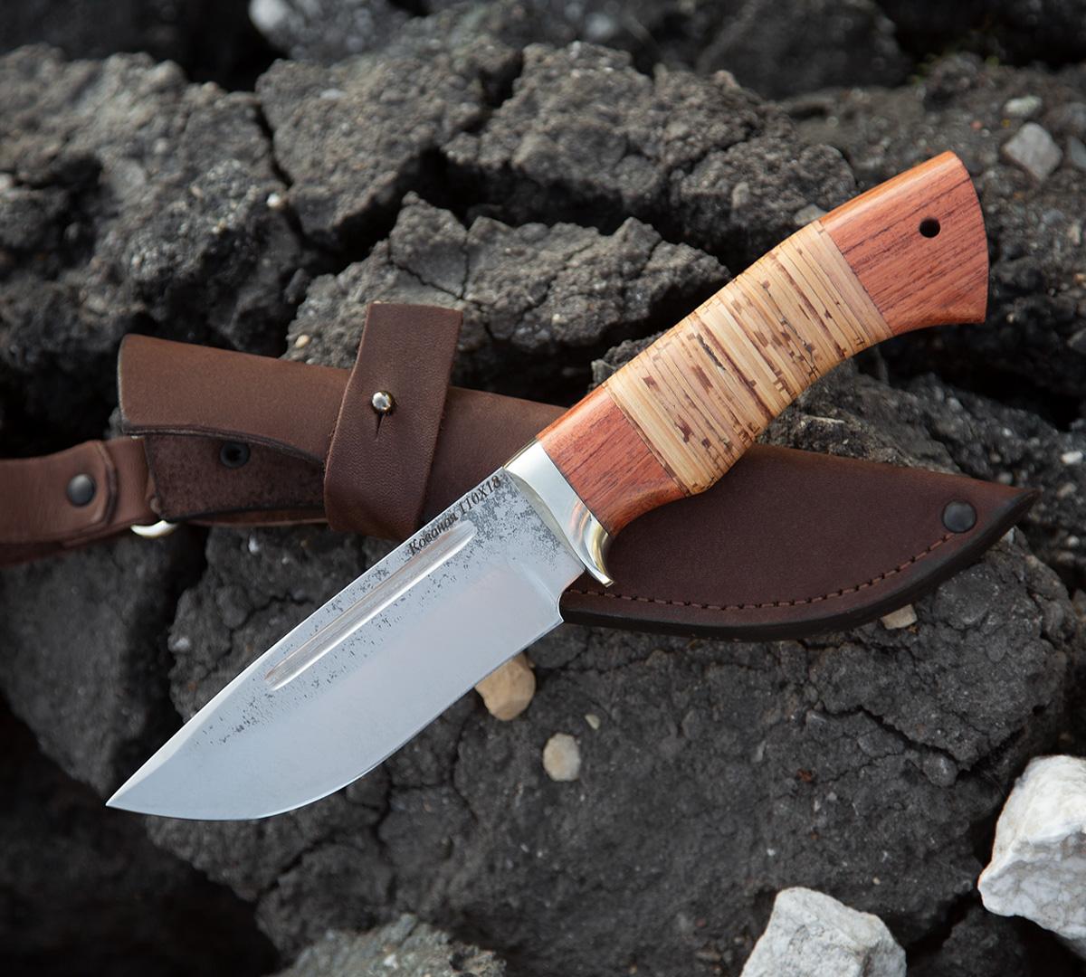 Нож Омуль из кованой нержавеющей стали 110Х18, рукоять - бубинга + береста, кожаный чехол идет в комплекте.