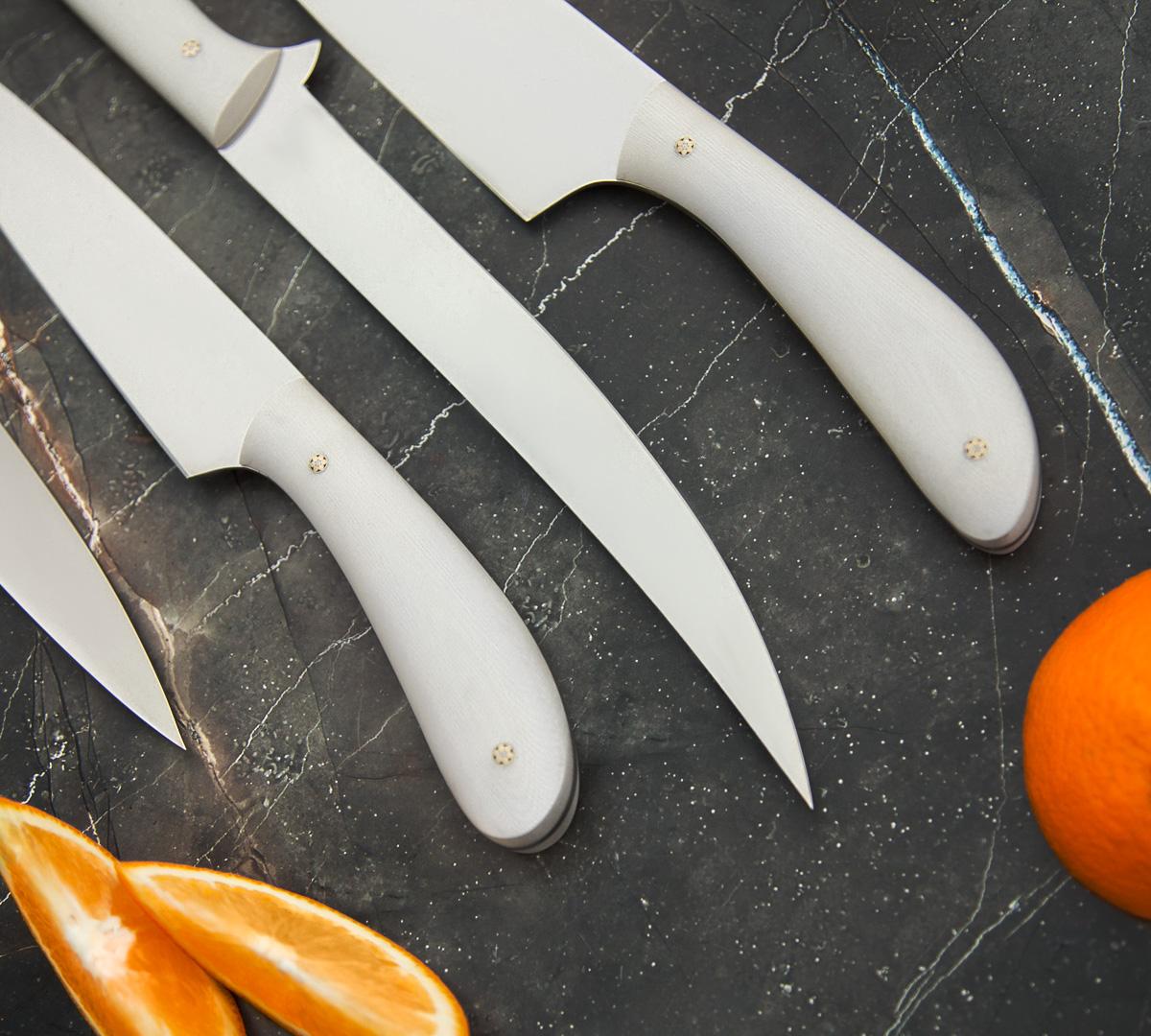 Набор кухонных ножей из нержавеющей стали N690, рукоять - G10, кожаные чехлы идут в кммплекте.