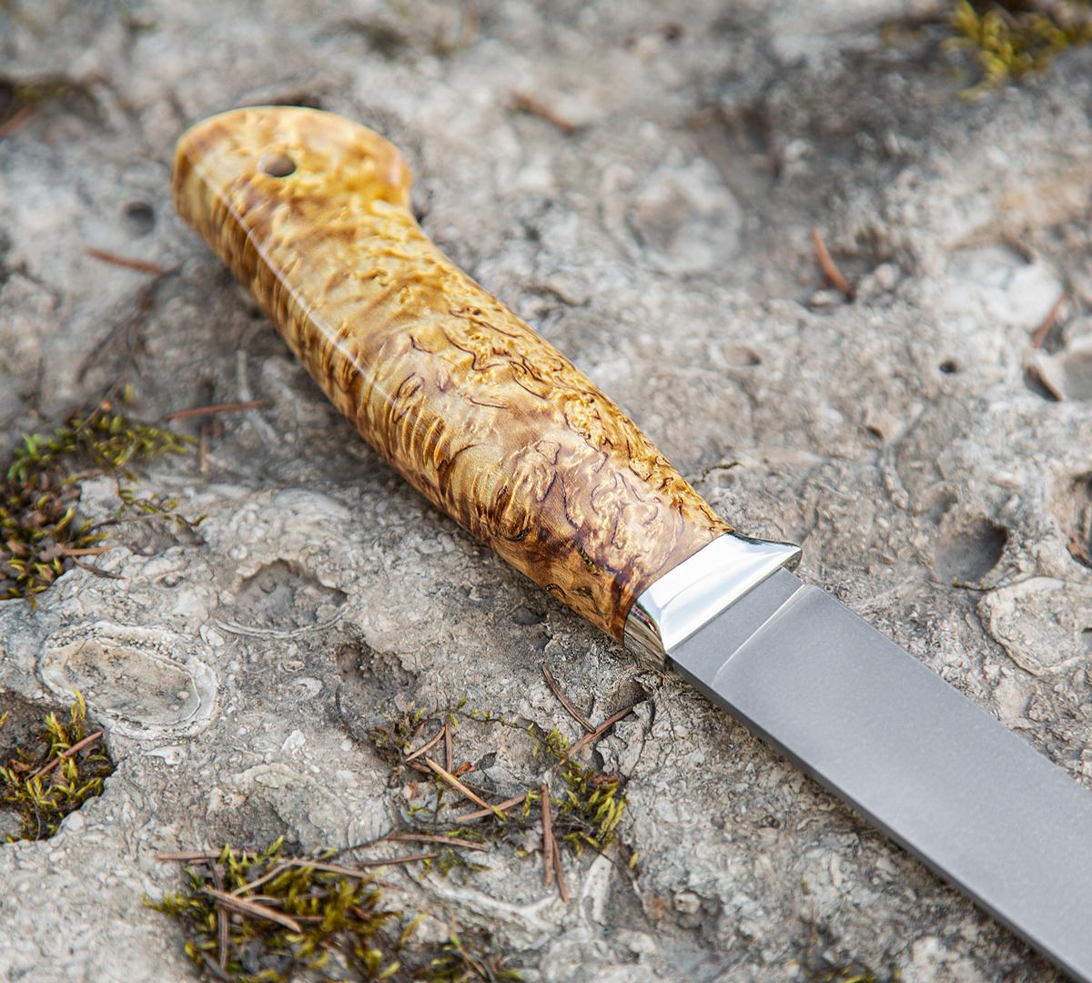 Нож Ладья из порошковой стали S390, рукоять - стабилизированный кап клена, кожаный чехол идет в комплекте.