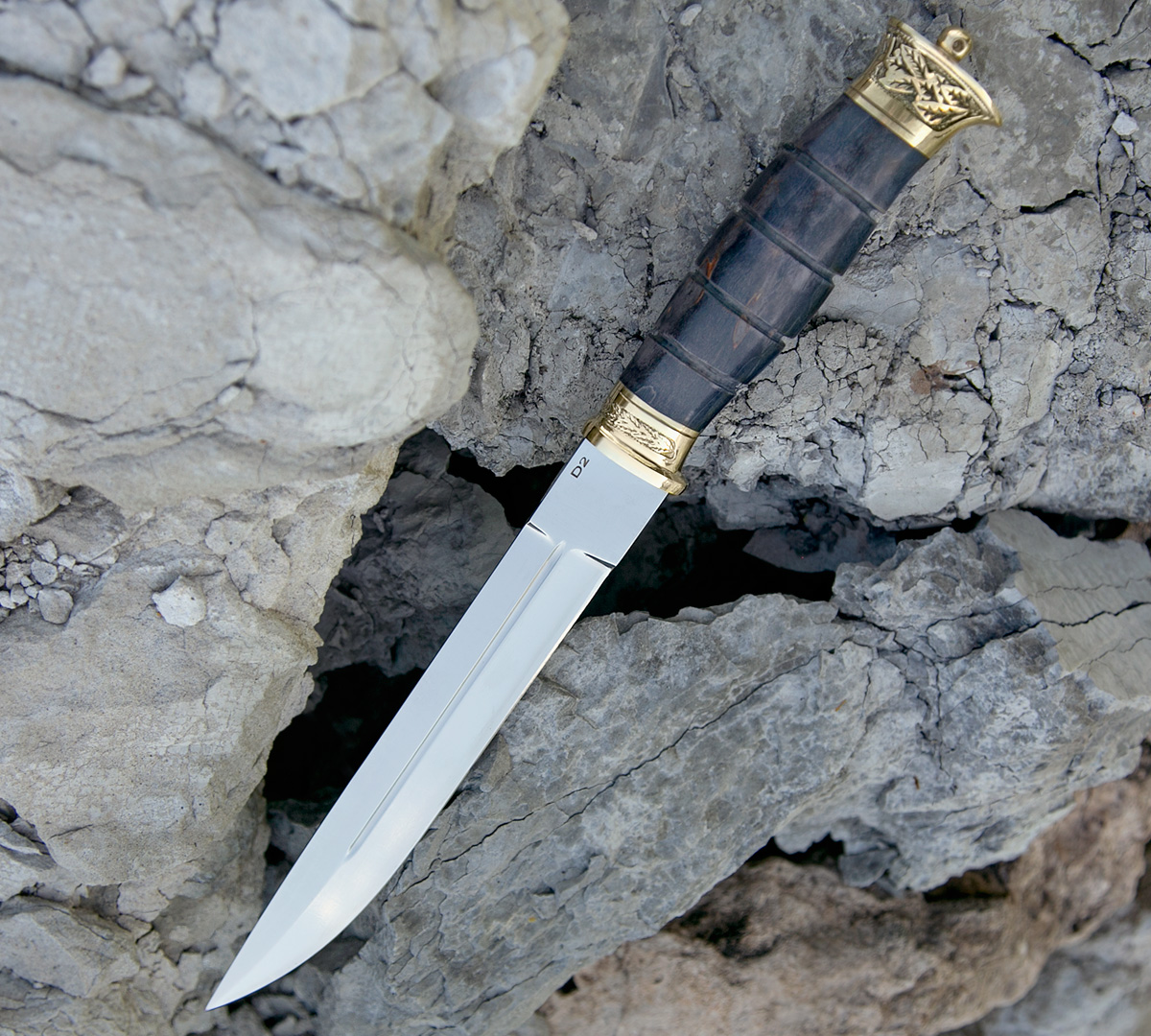 Нож Пластун из стали D2, рукоять - стабилизированная карельская береза, кожаный чехол идет в комплекте